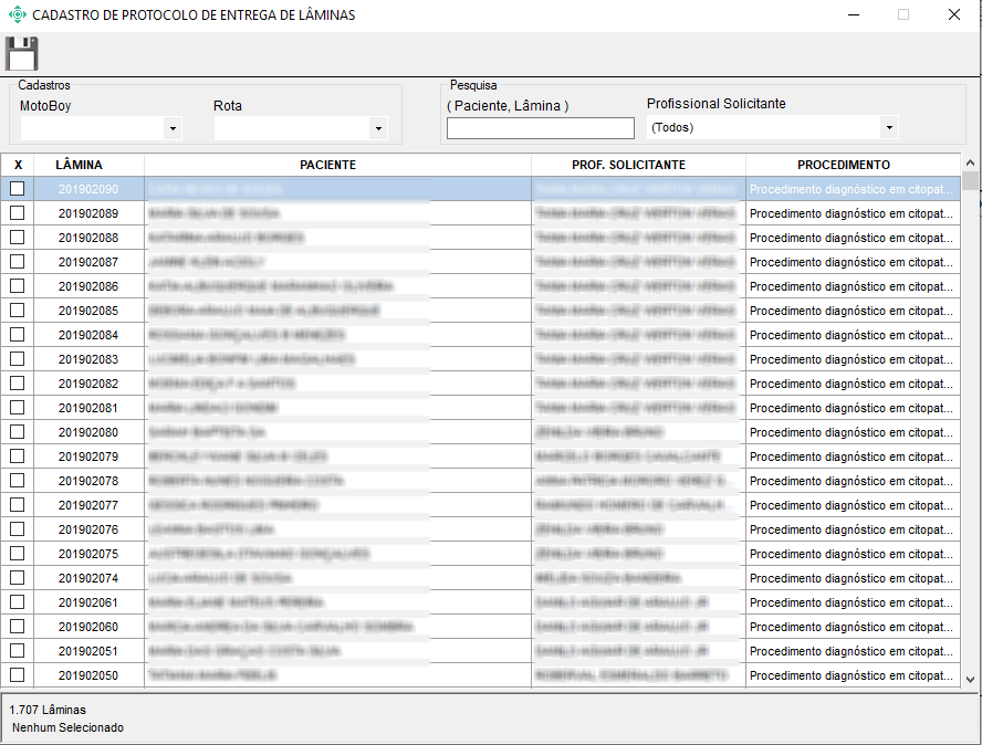 Ao clicar no botão abrirá a seguinte tela de cadastro com todas as lâminas do laboratório liberadas para entrega: