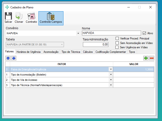 O botão ‘Controle Campos’ se encontra dentro do cadastro/alteração de cada plano, possibilitando uma configuração diferente para planos diferentes.