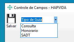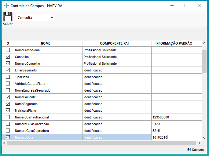 A lista com os campos e a configuração atual é carregada ao escolher o tipo de guia. Lembrando que a configuração padrão está de acordo com os campos obrigatórios do Tiss.