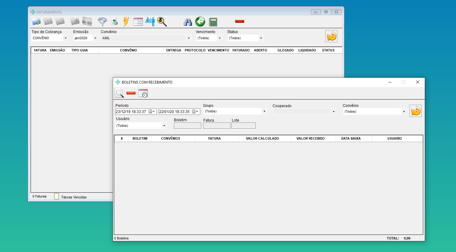 A tela de Boletins Recebidos se encontra dentro da tela de faturas no modulo de faturamento.