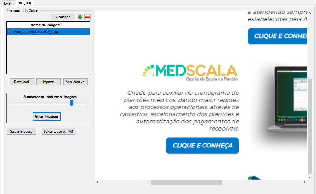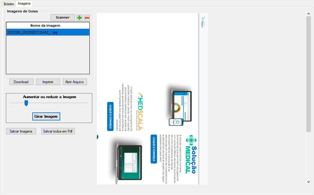 Agora você pode editar a imagem dentro do próprio cadastro da guia, afim de visualizar a imagem com mais clareza com a função de zoom na barra de rolagem em “Alterar ou Reduzir a Imagem”, ou mudar a orientação da mesma com a função de “Girar Imagem” como na situação a seguir: