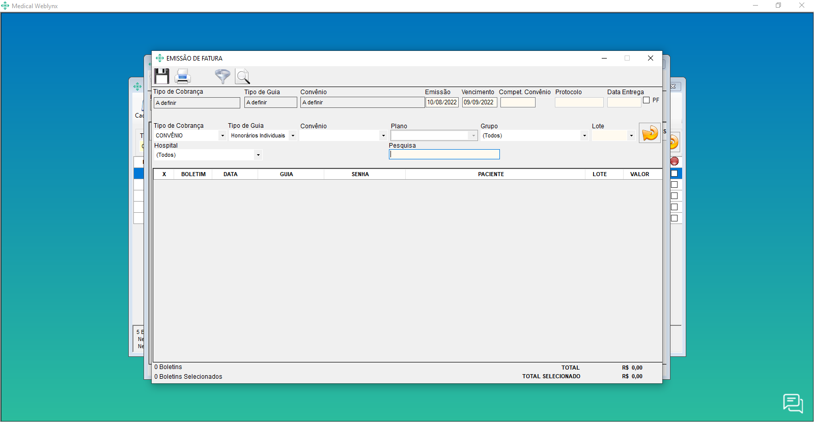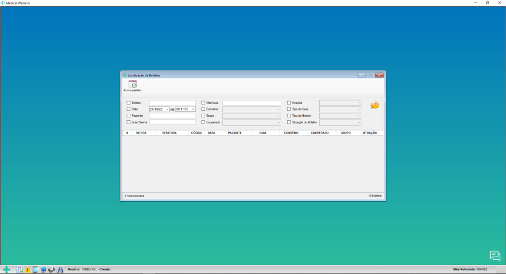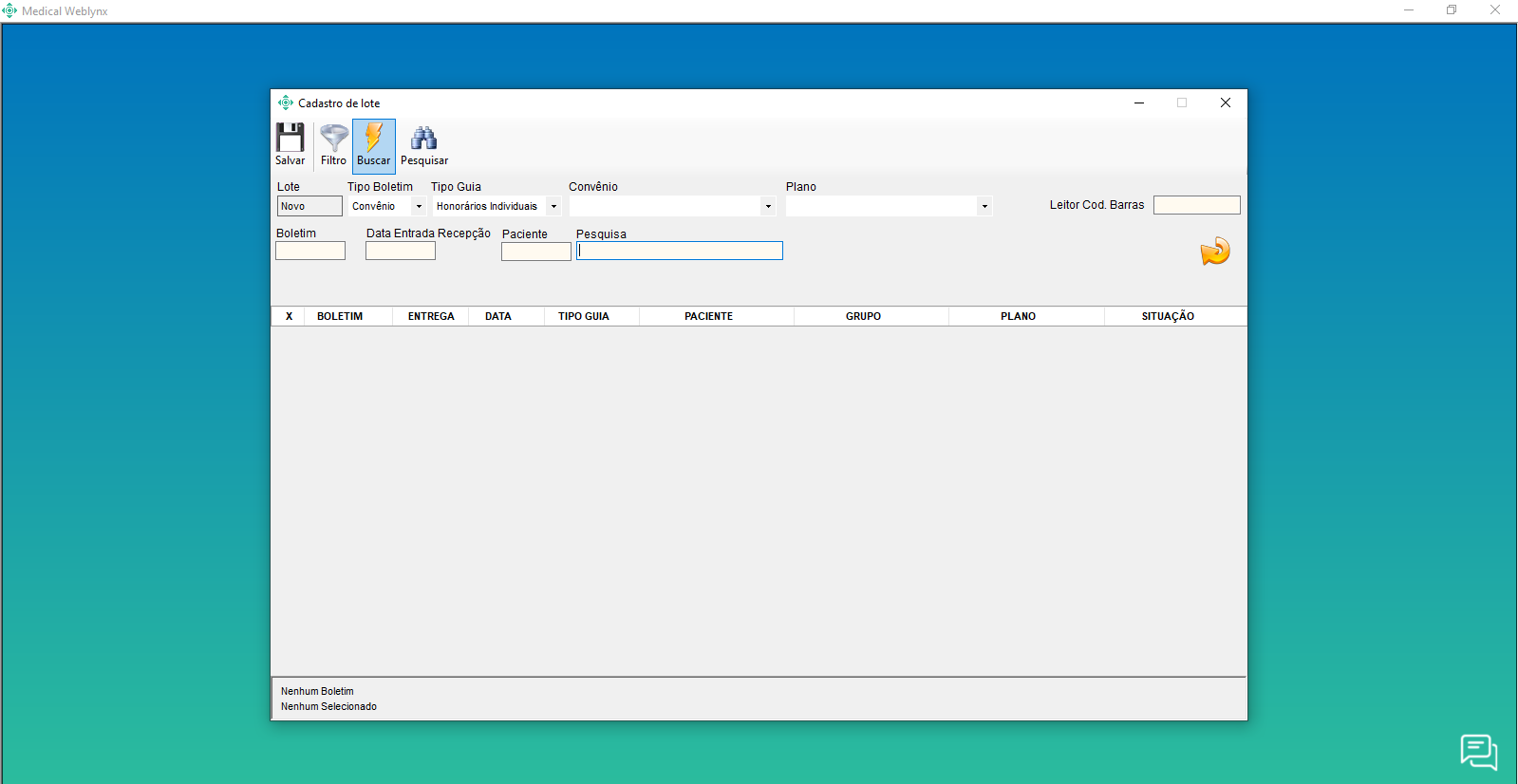 Foi adicionado ao programa Medical Weblynx um sistema de Busca Dinâmica. Esta busca pode localizar a linha através de qualquer informação das colunas nas telas de lote, fatura, remessa, tomador entre outros.