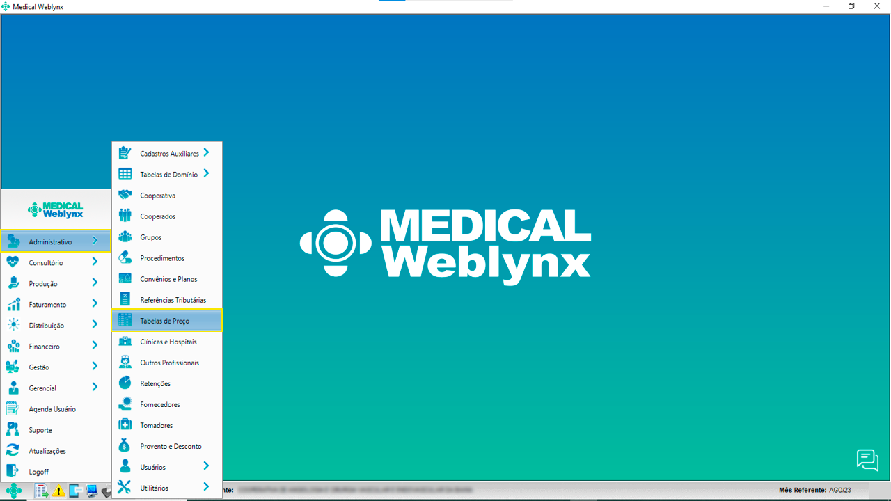 No menu “INICIAR”, clique na opção “ADMINISTRATIVO” e selecione “TABELA E PREÇOS”.