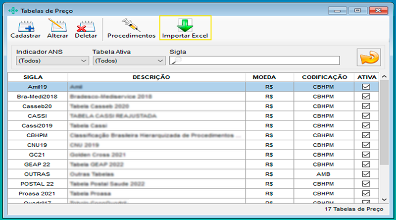 No menu da tabela de preços, clique em “IMPORTAR EXCEL”.