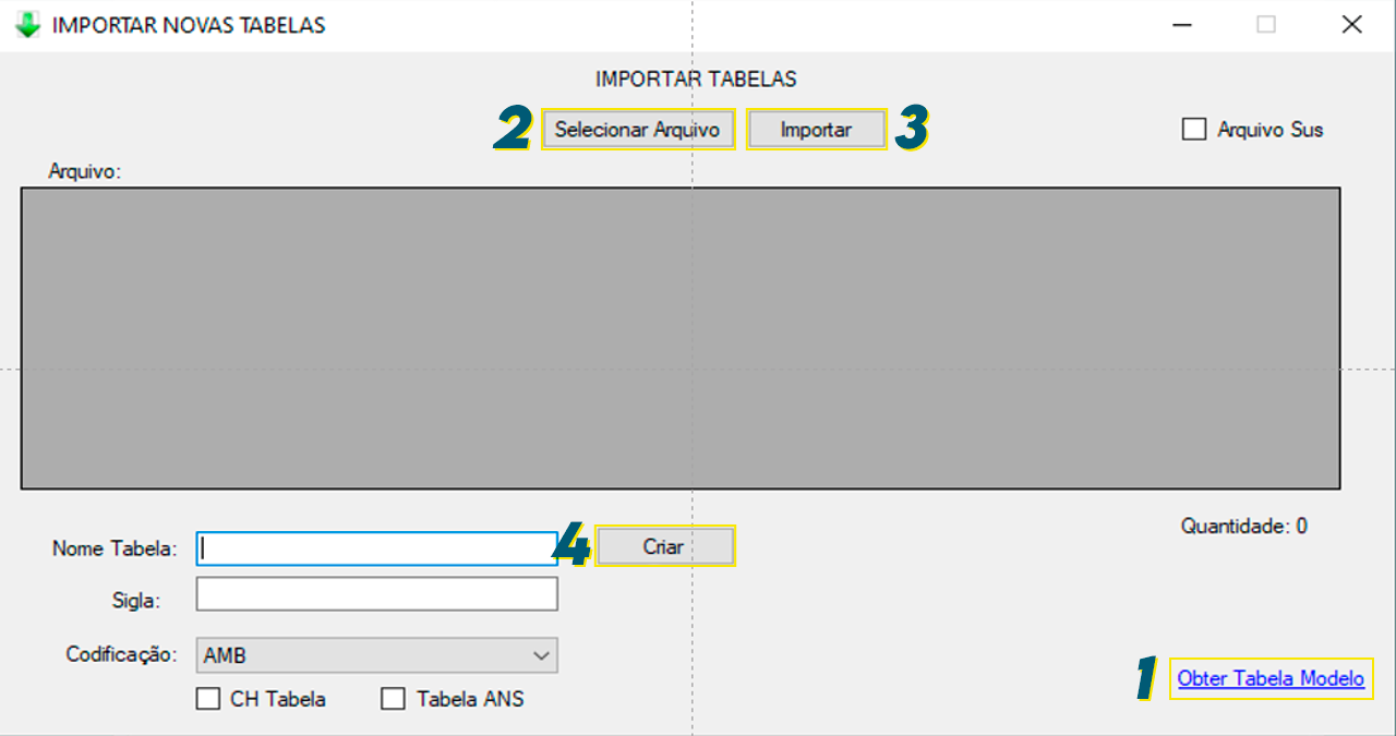 Use a opção “OBTER TABELA MODELO” (1), selecione a sua tabela em “SELECIONAR ARQUIVO” (2), importe ao sistema clicando em “IMPORTAR” (3), preencha as informações e crie uma tabela de preços clicando em “CRIAR” (4).